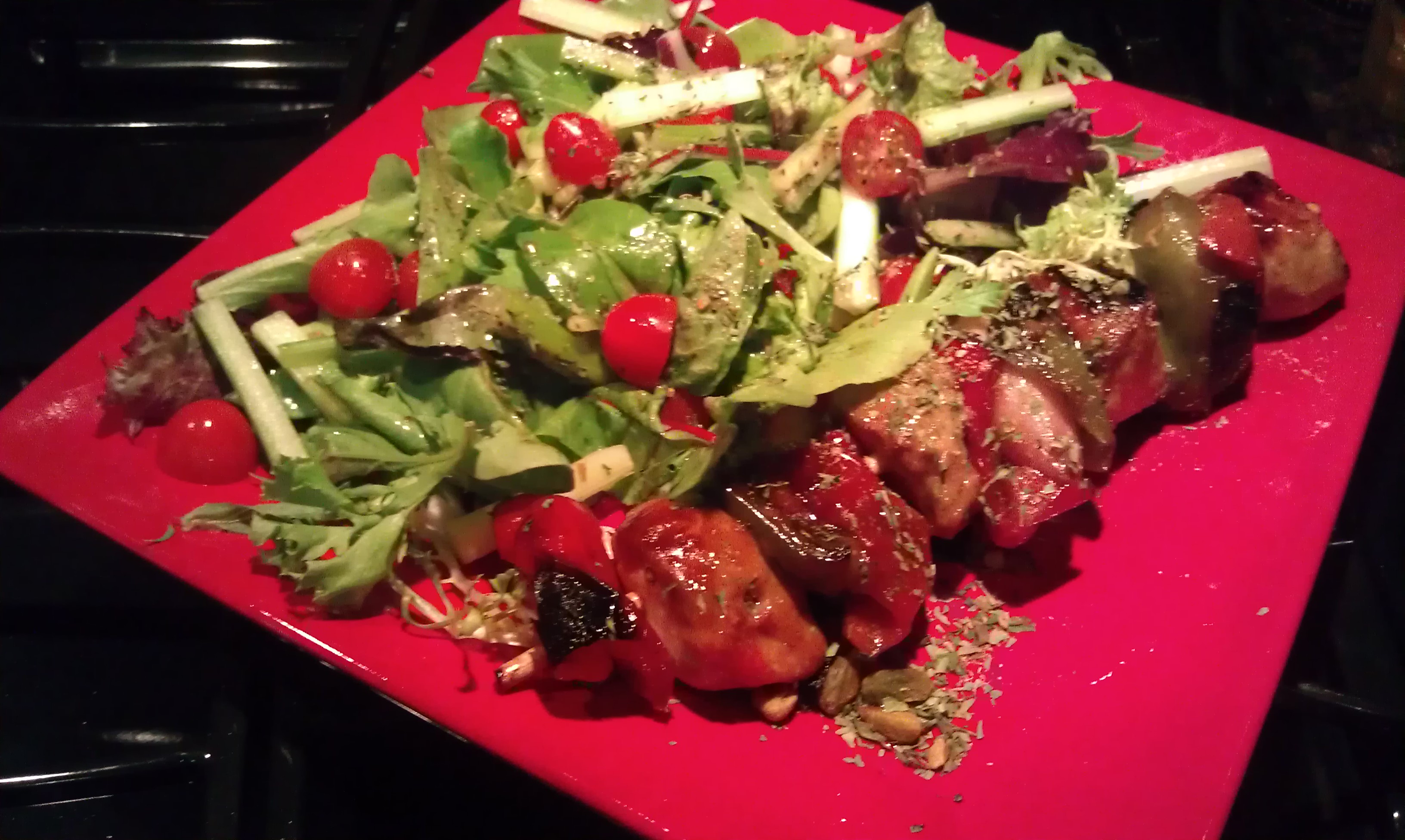 Sticking to natural eating is not hard, as long as you keep its many benefits top of mind and ensure a natural diversity of foods over time. This delicious natural meal features grilled chicken kabobs and veggies on a stick with mixed greens, julienne celery, cut pea pods, and halved grape tomatoes…garnished with pistachios, parsley, coriander, tarragon, and red pepper…